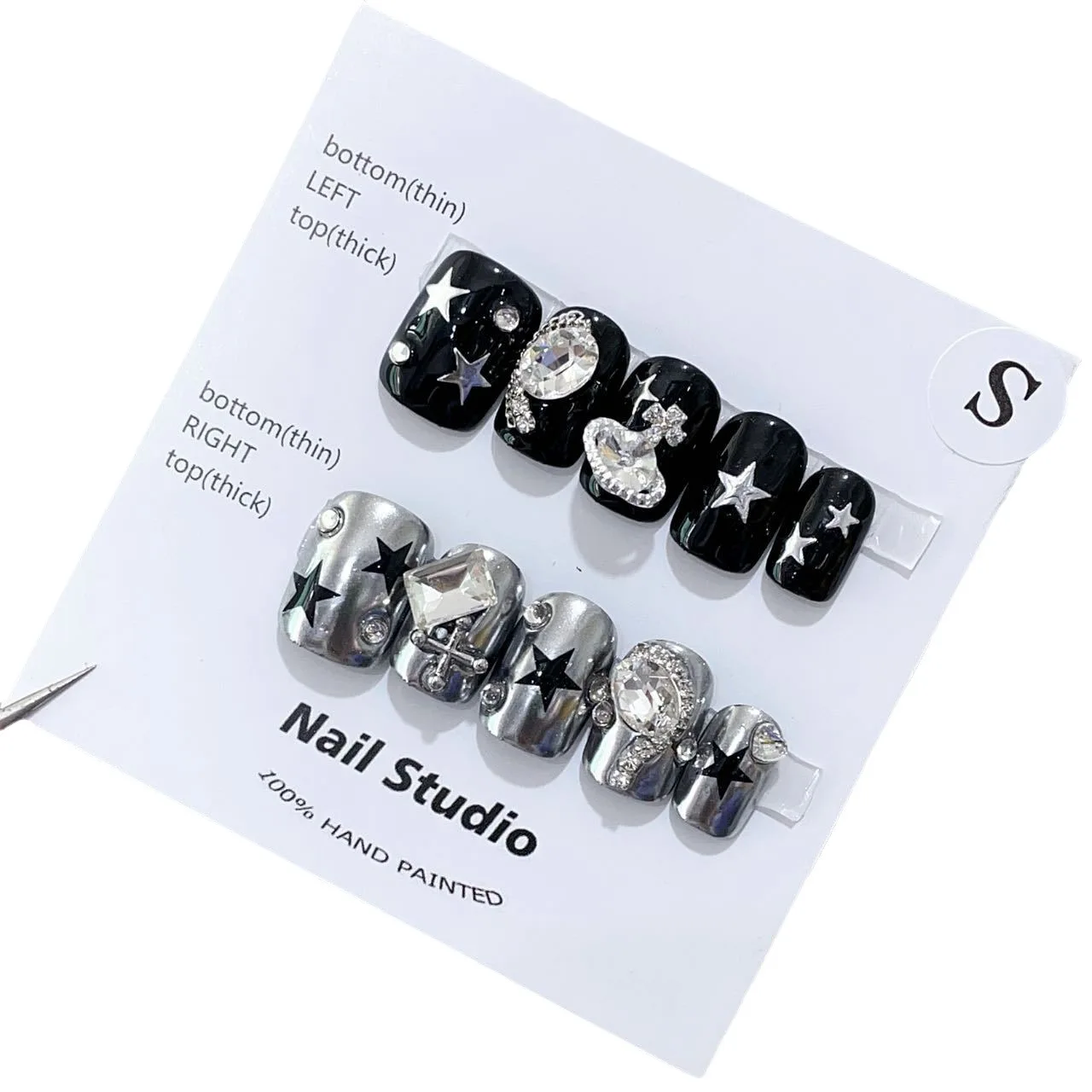 Silver Star Fake Nail Pressons Short Square Clear Rhinestones Punk Tip Saturn Stars False Tips Presson Y2k Black Press on Nails